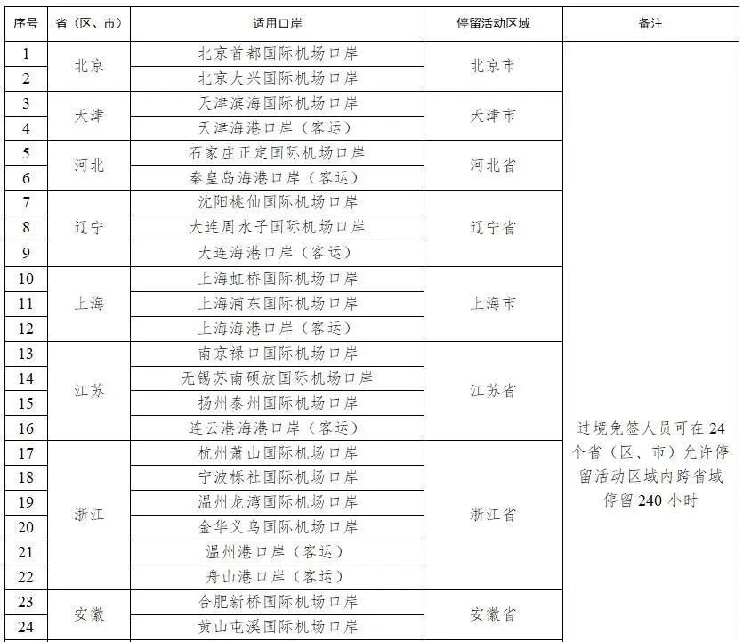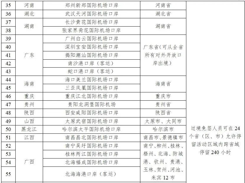 国家移民管理局今天发布公告,12月17日起全面放宽优化过境免签政策,将过境免签外国人在境内停留时间由原72小时和144小时均延长为240小时(10天),同时新增21个口岸为过境免签人员入出境口岸,并进一步扩大停留活动区域。符合条件的俄罗斯、巴西、英国、美国、加拿大等54国人员,从中国过境前往第三国(地区),可从24个省(区、市)60个对外开放口岸中任一口岸免签来华,并在规定区域停留活动不超过240小时。 此次放宽优化过境免签政策新增的21个口岸包括:山西太原武宿国际机场口岸,江苏无锡苏南硕放、扬州泰州国际机场口岸,浙江温州龙湾、金华义乌国际机场口岸,安徽合肥新桥、黄山屯溪国际机场口岸,福建福州长乐、泉州晋江、南平武夷山国际机场口岸,江西南昌国际机场口岸,山东济南遥墙、烟台蓬莱、威海大水泊国际机场口岸,湖南张家界荷花国际机场口岸,广西南宁吴圩、北海福成国际机场口岸,海南海口美兰、三亚凤凰国际机场口岸,四川成都天府国际机场口岸,贵州贵阳龙洞堡国际机场口岸。适用对外开放口岸由原有的39个增加至60个。 全面放宽优化后的240小时过境免签政策进一步扩大了停留活动区域。政策适用省份由原有的北京、天津、河北、辽宁、黑龙江、上海、江苏、浙江、福建、山东、河南、湖北、湖南、广东、广西、重庆、四川、云南、陕西19个省(区、市)增加山西、安徽、江西、海南、贵州5省,合计24个省(区、市)。新增的5省中,过境免签人员在安徽、海南、贵州3省停留活动区域为全省,在山西省停留活动区域为太原、大同市,在江西省停留活动区域为南昌、景德镇市。将福建、湖北、陕西3省停留活动区域扩大至全省,广西壮族自治区停留活动区域扩大至南宁、柳州、桂林、梧州、北海、防城港、钦州、贵港、玉林、贺州、河池、来宾12市行政区域。通过过境免签政策来华的外国人可在上述24个省(区、市)允许停留活动区域内跨省域旅行。 国家移民管理局相关负责人介绍,此次放宽优化过境免签政策是国家移民管理局认真学习贯彻中央经济工作会议精神、主动积极服务促进高水平对外开放、便利中外人员往来的重要举措,有利于加快推动人员跨境流动,促进对外交流合作,为经济社会高质量发展注入新动能。下一步,国家移民管理局将持续深入推进移民管理制度型开放,不断优化改进移民出入境便利政策,持续提升外国人来华学习、工作、生活便利度,欢迎更多的外国朋友来中国,亲身感受新时代中国之美。 外国人申请240小时过境免签政策的适用条件 一是属于54个适用过境免签政策国家的公民: 欧洲国家(40个):奥地利、比利时、捷克、丹麦、爱沙尼亚、芬兰、法国、德国、希腊、匈牙利、冰岛、意大利、拉脱维亚、立陶宛、卢森堡、马耳他、荷兰、波兰、葡萄牙、斯洛伐克、斯洛文尼亚、西班牙、瑞典、瑞士、摩纳哥、俄罗斯、英国、爱尔兰、塞浦路斯、保加利亚、罗马尼亚、乌克兰、塞尔维亚、克罗地亚、波黑、黑山、北马其顿、阿尔巴尼亚、白俄罗斯、挪威; 美洲国家(6个):美国、加拿大、巴西、墨西哥、阿根廷、智利; 大洋洲国家(2个):澳大利亚、新西兰; 亚洲国家(6个):韩国、日本、新加坡、文莱、阿联酋、卡塔尔。 二是需持本人有效国际旅行证件,有效期不少于3个月,符合前往第三国(地区)入境条件。 三是需持240小时内已确定日期及座位的前往第三国(地区)的联程客票或相关证明,填写临时入境外国人入境卡,接受出入境边防检查机关的检查和询问。 符合上述条件的外国人,可向中国北京、上海等地的60个口岸的边检机关提出申请,边检机关将为其办理临时入境手续,免签停留时间自入境次日零时起算。符合与我国签署互免签证协定或我单方面免签政策的,可从其规定。