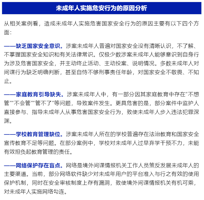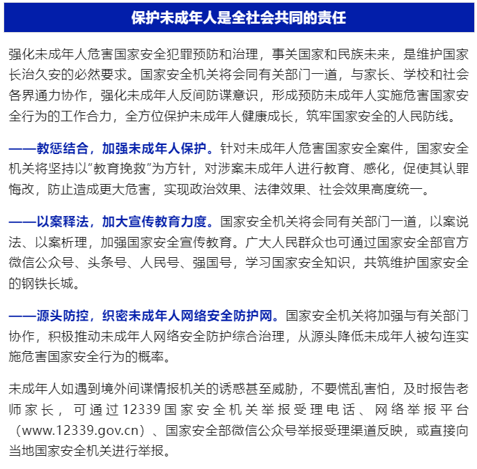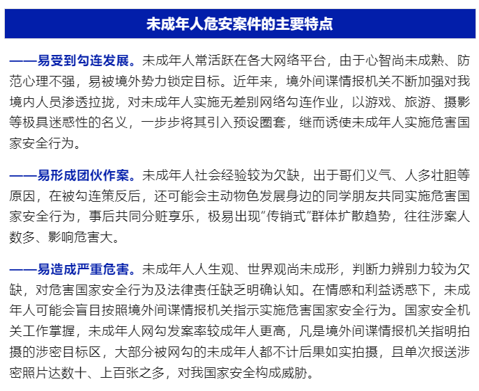 据国家安全部消息,“国家安全部”微信公众号曾先后发布《小心!披着羊皮的狼》《当心!境外黑手正伸向未成年人》等文章,披露了多起未成年人实施危害国家安全行为的典型案例。相关案例反映出近年来在境外间谍情报机关拉拢策反下,未成年人实施危害国家安全案件呈增加的趋势,需引起社会高度重视。