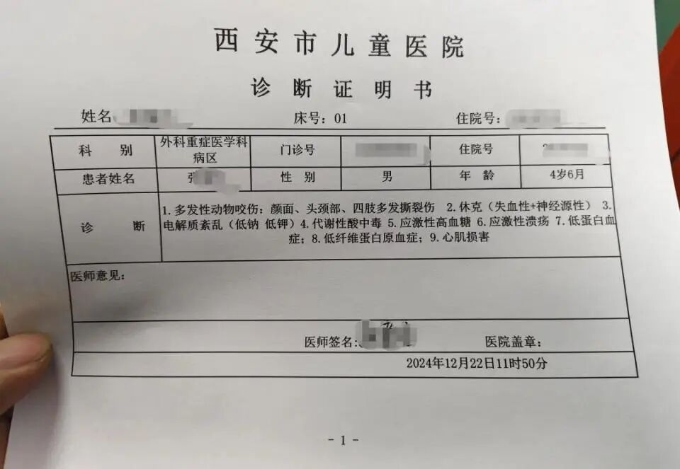 12月21日下午,陕西省西安市灞桥区豁口村发生一起恶犬伤人事件。4岁男童张逸川在村口附近玩耍时,被两只恶犬袭击,等家属赶到事发现场时,孩子受伤严重,已经陷入昏迷状态。