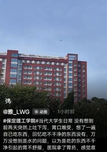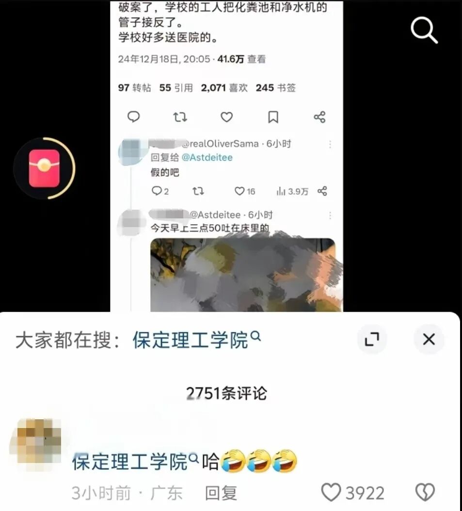 12月18日,据多名网友在社交发帖称,“某学校把化粪池和饮水机净化池接反了”“学校好多送医院的”“学生出现呕吐、腹泻以及发烧等症状”。评论区有网友指出,涉事学校为保定理工学院。
