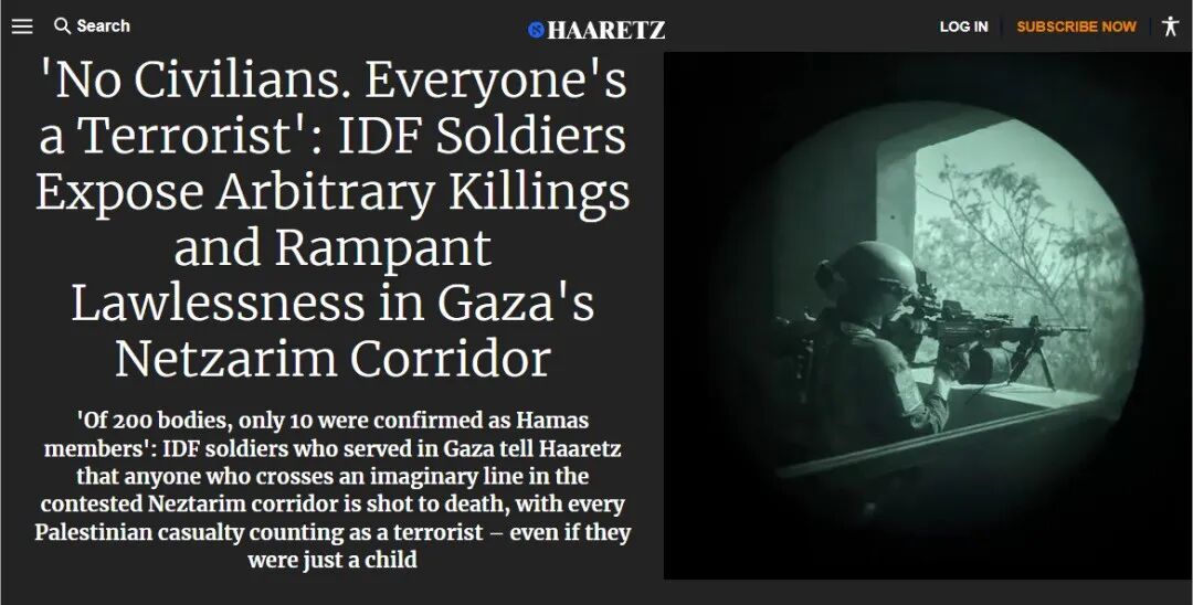 据环球时报19日报道,多名以色列国防军官兵向以色列《国土报》爆料称,以军在加沙地带“内察里姆走廊”附近任意射杀平民,不仅随意对未经确认身份的目标开火,不同部队甚至还在此展开了“杀人比赛”——“假如有战报称以军99师杀死了150人,那其他单位会把目标定为杀死200人”。