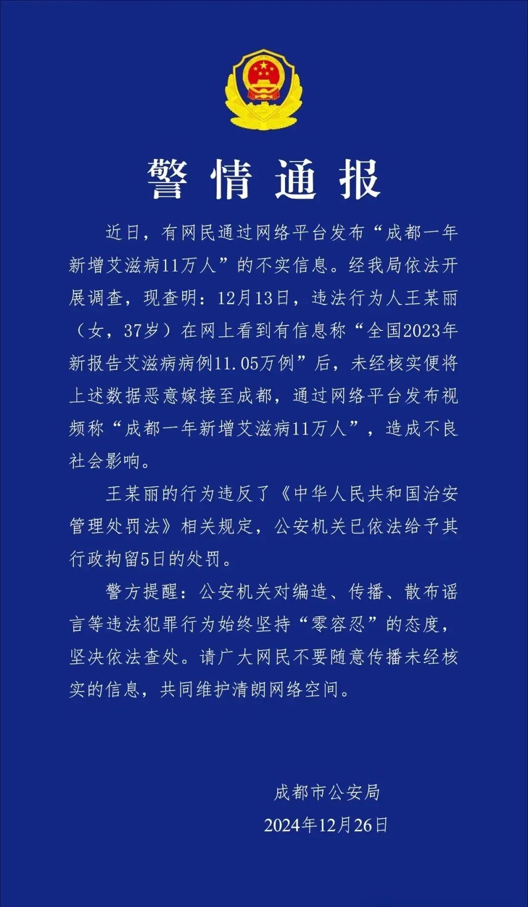 四川成都一年新增艾滋病11万人?当地警方最新通报