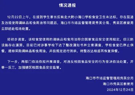近日,网传“海南海口市一小学食堂发现有多只老鼠活动”的监控视频,引发关注。 ![]() 12月24日,据海口市市场监督管理局秀英分局和海口市秀英区教育局联合通报,12月22日上午,在接到学生家长反映北大附小海口学校食堂卫生未达标,存在鼠迹及违规使用调味品和食用油等问题后,海口市市场监督管理局秀英分局、秀英区教育局立即赶赴现场处置。 经初步调查,该校食堂使用的调味品和食用油符合国家食品安全使用规定,但三防设施存在漏洞。目前已对涉事学校下达了整改通知书并立案调查,学校食堂已停止供餐,提标采购调味品和食用油,并按规定进行消杀,待整改达标后再恢复供餐。 下一步,两部门依法依规开展调查,对违反校园食品安全的行为坚决依法处置,并举一反三,加强辖区校园食品安全监管。 12月25日上午,北大附小海口学校工作人员表示,食堂目前确实已经停餐整改了,具体何时整改完成,其个人暂不清楚,整改完成后,学校将向有关部门汇报,或对外发布通报。