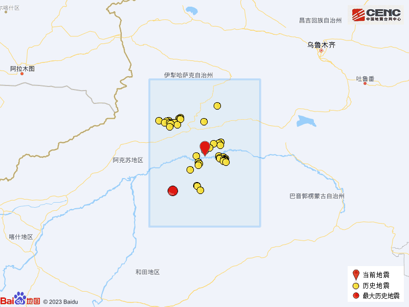 历史地震:根据中国地震台网速报目录,震中周边200公里内近5年来发生3级以上地震共482次,最大地震是2023年1月30日在新疆阿克苏地区沙雅县发生的6.1级地震(距离本次震中154公里),按震级大小前50次历史地震分布如图。