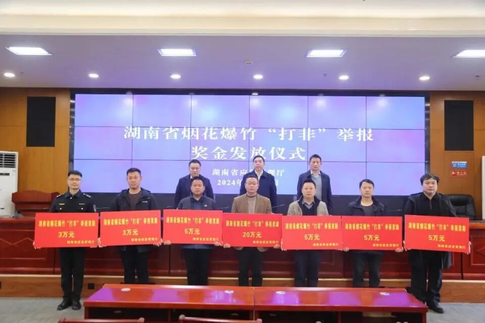 12月30日上午,湖南省应急管理厅举行烟花爆竹“打非”举报奖金发放仪式,向7起典型案件的举报人发放奖金46万元。