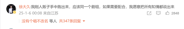 据媒体报道,演员徐大久在评论区称,其刚从人贩子手中跑出来,“应该同一个剧组。”