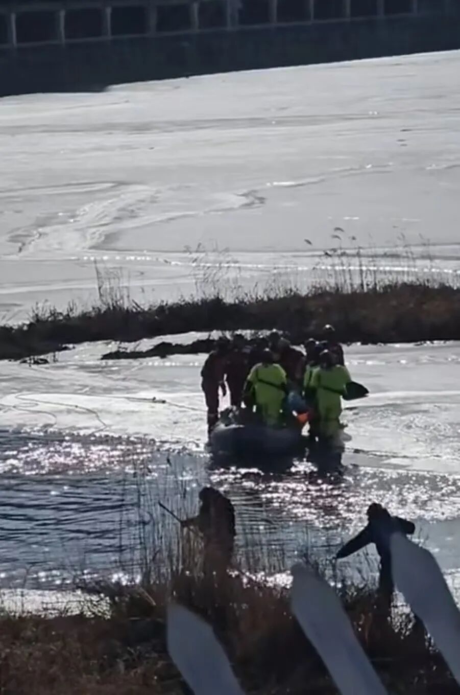网传现场画面显示,结冰的水面上有多名救援人员正在切割冰面进行救援,岸边围满了人群,多辆消防车停在路边,车灯闪烁。