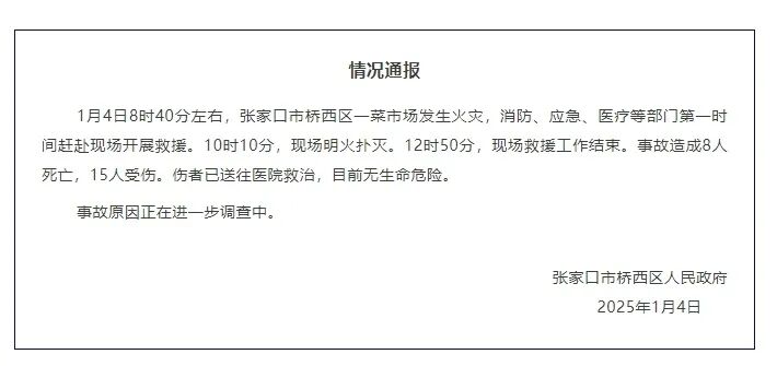 河北张家口市桥西区人民政府发布情况通报:1月4日8时40分左右,张家口市桥西区一菜市场发生火灾,消防、应急、医疗等部门第一时间赶赴现场开展救援。10时10分,现场明火扑灭。12时50分,现场救援工作结束。事故造成8人死亡,15人受伤。伤者已送往医院救治,目前无生命危险。