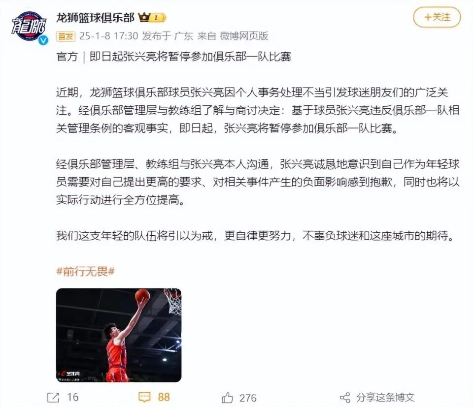 龙狮篮球俱乐部在公告中表示:近期,龙狮篮球俱乐部球员张兴亮因个人事务处理不当引发球迷朋友们的广泛关注。经俱乐部管理层与教练组了解与商讨决定:基于球员张兴亮违反俱乐部一队相关管理条例的客观事实,即日起,张兴亮将暂停参加俱乐部一队比赛。 经俱乐部管理层、教练组与张兴亮本人沟通,张兴亮诚恳地意识到自己作为年轻球员需要对自己提出更高的要求、对相关事件产生的负面影响感到抱歉,同时也将以实际行动进行全方位提高。 我们这支年轻的队伍将引以为戒,更自律更努力,不辜负球迷和这座城市的期待。 此前报道: 近日,有网友在社交平台爆料称,1月5日对阵青岛赛前,广州龙狮篮球俱乐部球员张兴亮将女友装进行李箱并带回宿舍通宵补习,帮重修课的女友准备作业。其女友还在微博晒出相关照片,目前该社媒已经被删除。