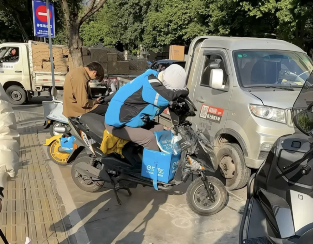 该网友还附上了4张现场拍摄的照片。画面显示,一外卖骑手趴在车上休息时,将保温箱放在电动自行车的踏板处,双脚则放在了保温箱里。