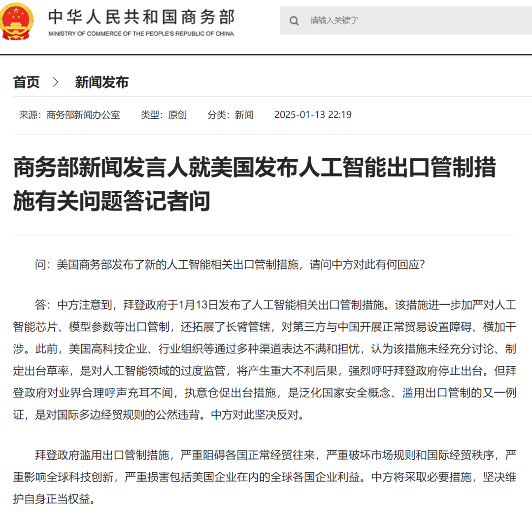 问:美国商务部发布了新的人工智能相关出口管制措施,请问中方对此有何回应?