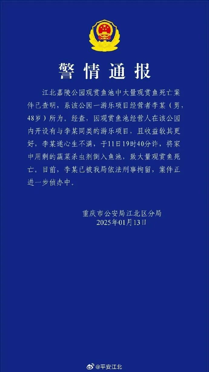 江北嘉陵公园观赏鱼池中大量观赏鱼死亡案件已查明,系该公园一游乐项目经营者李某(男,48岁) 所为。