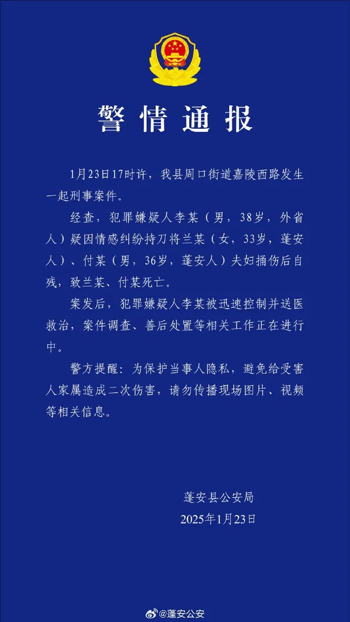 四川南充一男子持刀捅死夫妻二人后自残,当地警方通报