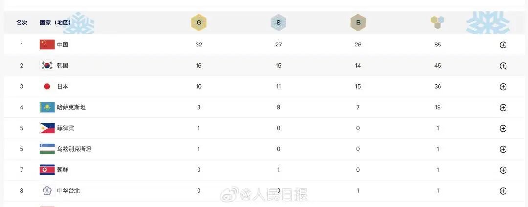 2月14日,随着哈尔滨亚冬会女子冰球中国队对阵日本队的比赛结束,中国体育代表团在本届亚冬会所有比赛项目全部结束。最终,中国体育代表团收获32金、27银、26铜共计85枚奖牌,位列本届亚冬会金牌榜和奖牌榜首位,创造亚冬会历史参赛最好成绩。