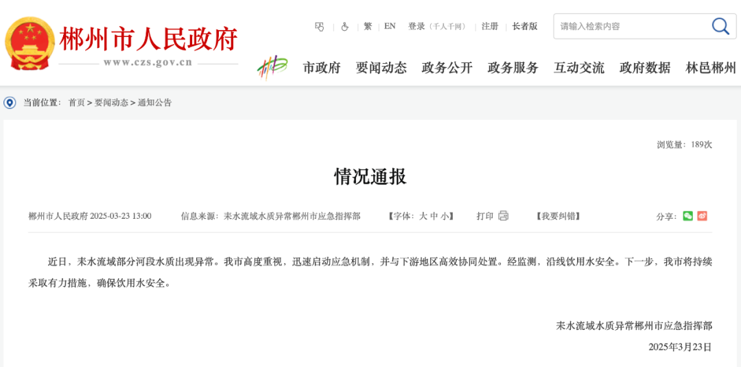 湖南省郴州市政府网站消息,耒水流域水质异常郴州市应急指挥部3月23日发布情况通报:近日,耒水流域部分河段水质出现异常。我市高度重视,迅速启动应急机制,并与下游地区高效协同处置。经监测,沿线饮用水安全。下一步,我市将持续采取有力措施,确保饮用水安全。