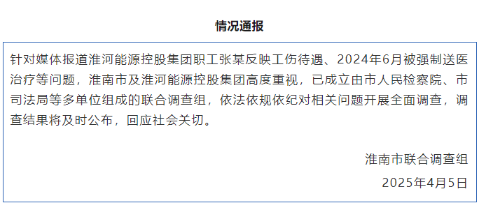 针对媒体报道淮河能源控股集团职工张某反映工伤待遇、2024年6月被强制送医治疗等问题,淮南市及淮河能源控股集团高度重视,已成立由市人民检察院、市司法局等多单位组成的联合调查组,依法依规依纪对相关问题开展全面调查,调查结果将及时公布,回应社会关切。
