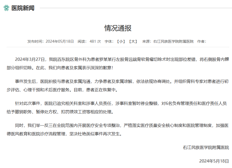 广西百色17岁体育生左膝长骨瘤却被错切右膝!母亲:拒绝和解发表时间:2025-04-20 21:20 ![]() 4月20日,据新京报我们视频,广西百色体育生“左膝长骨瘤被医生错切右膝”一事有新进展。 ![]() 当事人小罗的母亲何女士称,儿子与右江民族医学院附属医院医疗损害责任纠纷案将在4月22日开庭。 ![]() 何女士称,事情发生后,孩子在家里休养近一年,“他心里也过不去那个坎,高三了,体育生本来要锻炼维持数据的”。 此前,2024年5月,广西百色一名家长反映,自家孩子左膝长骨瘤,在当地一家三甲医院做手术,却被错切右膝组织,相关消息引发关注。 当事学生家长表示,事情发生在今年3月底,自家孩子17岁,是体育特长生,就诊于右江民族医学院附属医院百东院区。当天,手术还没结束,医生便出来说他做错了,误切了右膝。 ![]() 该家长提供的医学影像诊断报告单显示,诊断意见为“左股骨内侧髁骨软骨瘤、左膝关节少量积液”,手术前签署的知情同意书上也写着“左股骨远端软骨瘤切除手术”。 然而在手术记录单上,手术名称却是“右股骨远端肿物切除”。从孩子的术后照片可以看到,右膝有术后缝合痕迹,而左膝的肿物肉眼可见,骨头有明显的外凸。 5月18日,右江民族医学院附属医院就此事发布情况通报,称对6名负有管理责任和医疗责任人员给予撤销职务、暂停处方权、扣罚绩效工资等相应的处理。 ![]() 通报内容如下: 2024年3月27日,我院百东院区骨外科为患者罗某某行左股骨远端骨软骨瘤切除术时出现部位差错,将右侧股骨内髁部分组织切除。在此,我们向患者及家属表示深深的歉意! 事件发生后,医院积极与患者及家属沟通,力争患者及家属谅解,依法依规协商调处。并组织骨科专家对患者进行初步评估、心理干预和术后医疗服务。目前,患者正在恢复中。 针对此次事件,医院已追究相关科室和涉事人员责任,涉事科室暂时停业整顿,对6名负有管理责任和医疗责任人员给予撤销职务、暂停处方权、扣罚绩效工资等相应的处理。 同时,我们举一反三在全院范围内开展医疗安全专项整治,严格落实医疗质量安全核心制度和医院管理制度,加强医德医风教育和医院诊疗流程管理,坚决杜绝类似事件再次发生。 END 来源:九派新闻、现代快报、新京报 编辑:王宇豪 审核:溪溪 ![]() 声明:部分文章来源于网络,转载发布,版权归原作者所有,仅作为参考,如果网站中图片和文字侵犯了您的版权,请联系我们处理!发布是出于传递更多信息之目的并不意味着赞同其观点或证实内容的真实性。http://www.westtimes.cn/h-nd-5070.html