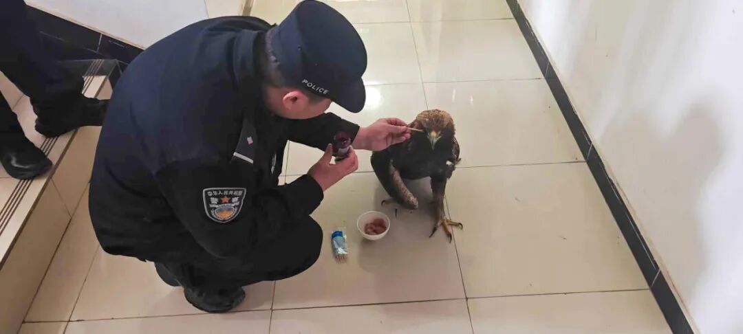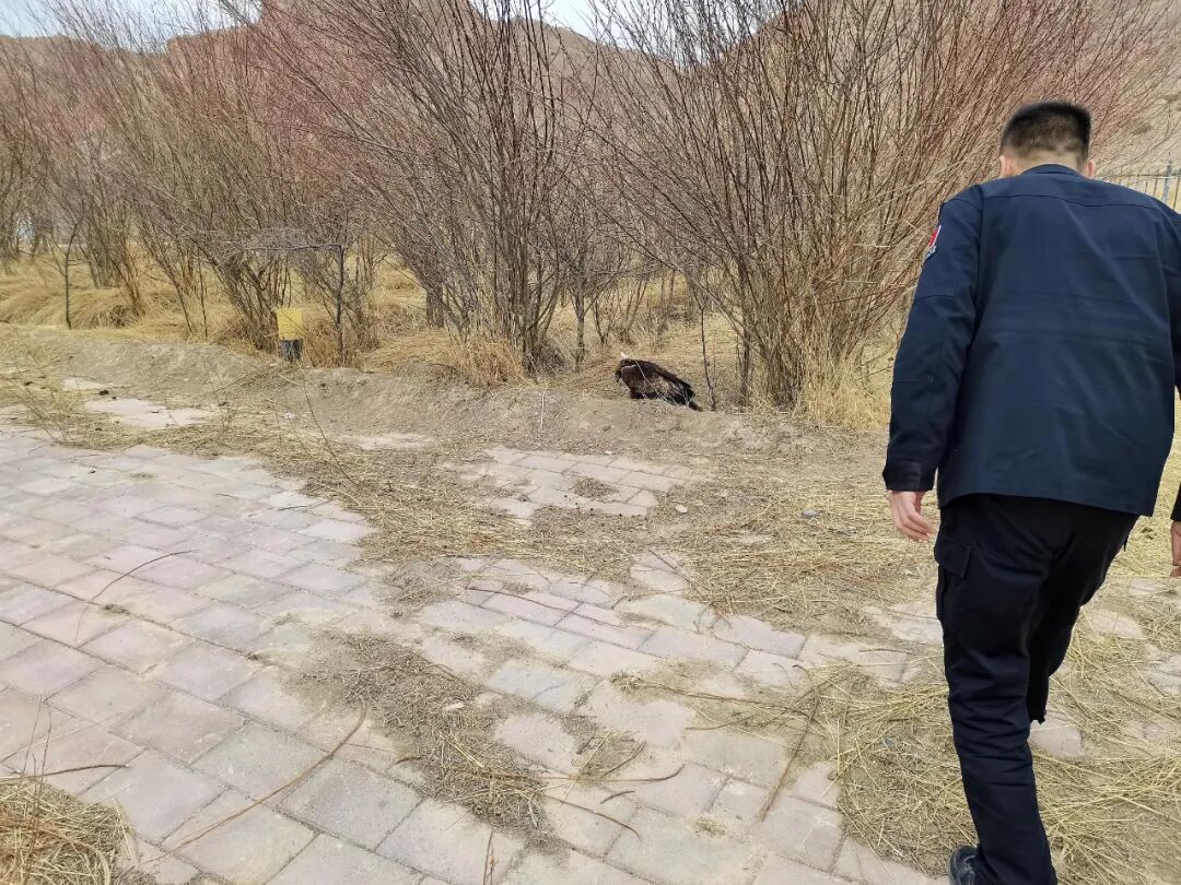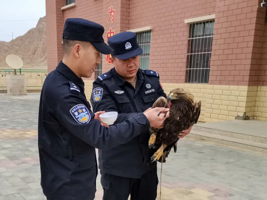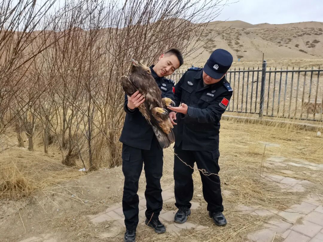 4月11日,新疆出入境边防检查总站克州边境管理支队喀拉布拉克边境派出所民警巡逻时,发现路边草丛中有只行动迟缓的“老鹰”,初步核实为国家一级保护动物金雕,经检查,金雕因翅膀骨折,无法飞行,民警便将金雕带回派出所照顾,用碘伏等药品进行简单消毒处理,耐心投喂食物,目前已移交给野生动物救助部门进行专业治疗,金雕将在救助站康复后放归自然。