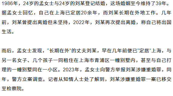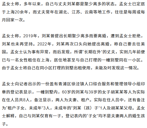 ![]() ![]() 丈夫与情人以夫妻名义生活 ![]() ![]() ![]() 丈夫曾以1000元 孟女士告诉记者,自己并不是不能接受离婚,但不能接受刘某对于离婚一事的处理。“他涉嫌重婚,变卖家产,和情人及私生子一起去国外生活。”她解释,刘某提出的要求是口头表述,并非书面协议,记者未能看到相关协商记录。不过,双方至少已产生两起民事诉讼。 2023年,孟女士曾起诉刘某等。该案二审判决书显示,孟女士与刘某共同购买了一辆奔驰车,2023年,刘某与一公司签订车辆买卖合同,约定车辆价款1000元,该公司成立时法定代表人即为胡某某。孟女士起诉请求确认合同无效,二审判决,刘某与公司之间恶意串通,损害孟女士合法权益,认定买卖合同无效。 2025年,刘某起诉孟女士及两人所育孩子,主张一房产为夫妻共同财产,认为孟女士未经刘某同意将房屋变更至孩子名下,要求认定无效。起诉书显示,刘某提出,2017年,自己与孟女士感情破裂,近期,其准备向法院提起离婚诉讼。该案尚未开庭。 据第一财经报道,刘某曾于1982年10月至1995年2月在民航局山东省局担任副处长,此后长期在东航历经多个重要岗位,担任过东航山东分公司副总和东航北京基地书记,2005年到2009年在上海东美旅游担任总经理,2009年至2011年为东航武汉公司总经理,后担任东航江苏有限公司的总经理。离开东航后,刘某曾出任红土航空(现湖南航空)总经理。 对于刘某目前在何处任职、担任何具体职务,孟女士称自己并不清楚:“我一直以为他还在以前的公司,他没有和我说过(工作变动)。”她计划向刘某此前就职的公司反映刘某相关问题。 END 来源:红星新闻 编辑:王宇豪 审核:溪溪 ![]() 声明:部分文章来源于网络,转载发布,版权归原作者所有,仅作为参考,如果网站中图片和文字侵犯了您的版权,请联系我们处理!发布是出于传递更多信息之目的并不意味着赞同其观点或证实内容的真实性。http://www.westtimes.cn/h-nd-5419.html