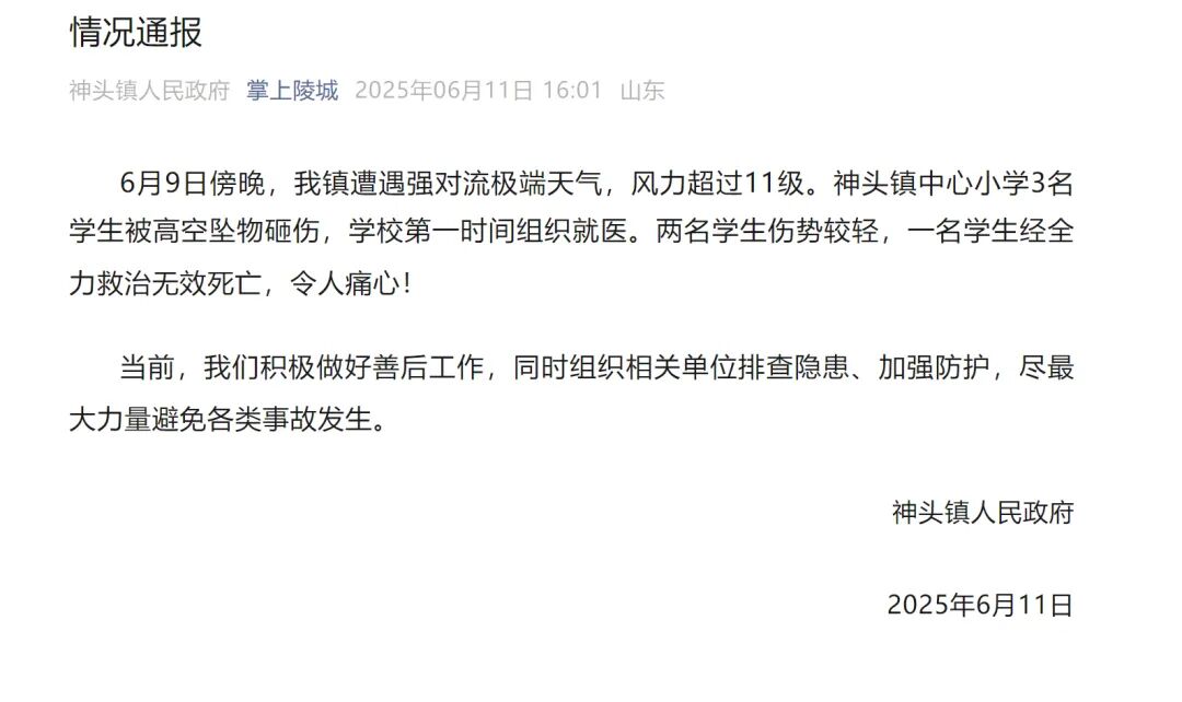 据掌上陵城微信公众号消息,6月11日,山东德州神头镇人民政府发布情况通报。6月9日傍晚,神头镇遭遇强对流极端天气,风力超过11级。神头镇中心小学3名学生被高空坠物砸伤,学校第一时间组织就医。两名学生伤势较轻,一名学生经全力救治无效死亡,令人痛心!