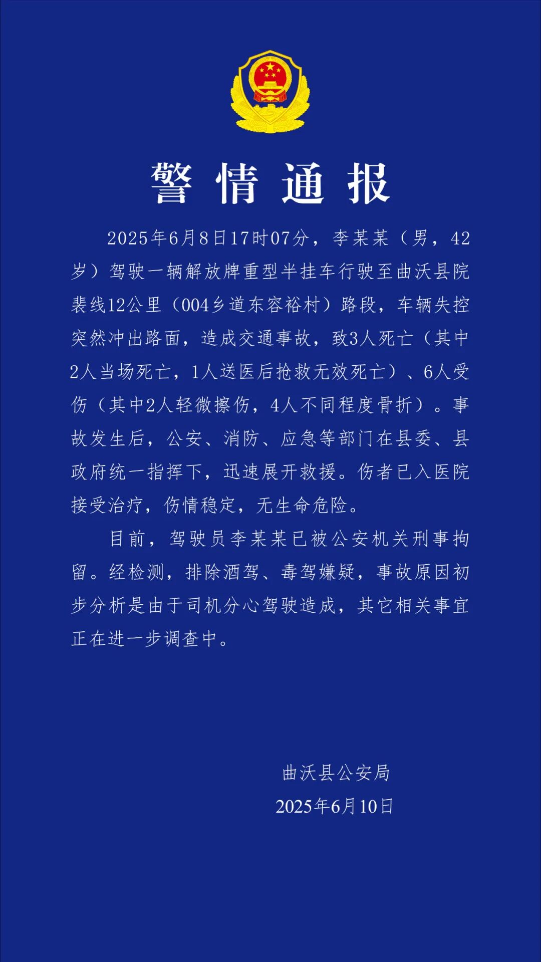 2025年6月8日17时07分,李某某(男,42岁)驾驶一辆解放牌重型半挂车行驶至曲沃县院裴线12公里(004乡道东容裕村)路段,车辆失控突然冲出路面,造成交通事故,致3人死亡(其中2人当场死亡,1人送医后抢救无效死亡)、6人受伤(其中2人轻微擦伤,4人不同程度骨折)。