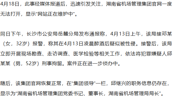 涉嫌饭局后性侵女子被刑拘,湖南省机场管理局局长职务信息被撤!发表时间:2025-06-03 11:33 ![]() 今年4月,湖南省机场管理集团党委书记、董事长,湖南省机场管理局局长邱继兴,因涉嫌性侵一女子被警方刑拘一事引发广泛关注。目前,该集团已迎来新任党委书记、董事长,官网已撤下邱继兴职务信息,集团官方微信公众号中大量关于他的内容也已消失。 ![]() ![]() 6月2日,据媒体报道,湖南省机场管理集团官网上关于邱继兴的职务信息已经撤下,“集团领导”一栏中“湖南省机场管理集团”的表述改为了“湖南省机场管理集团有限公司”,该公司已迎来新任党委书记、董事长舒某,并同样担任湖南省机场管理局局长。 ![]() 值得注意的是,该集团官方微信公众号曾发布了大量关于邱继兴的文章。文章内容显示,邱继兴在多个场合的发言中均提到了关于纪律和工作作风的要求,事发的一个多月前,他还在会上要求“要严守纪律底线”。目前,这些内容均已消失。 1990年7月至1994年6月,就读于湖南农业大学动物科学学院兽医专业。毕业后,历任湖南长沙浏阳市永和镇畜牧水产站干部、张坊镇镇长助理、张坊镇副镇长;共青团浏阳市委书记;共青团长沙市委副书记、书记、党组书记;长沙市雨花区委副书记、副区长、区长、区委书记;长沙市政府副秘书长。2017年1月,升任长沙市副市长,成为副厅级干部;后又任长沙市委常委、中国(湖南)自由贸易试验区长沙片区党工委书记。2023年11月,邱继兴出任湖南省属国企湖南机场集团党委书记、董事长,湖南省机场管理局局长,成为正厅级干部。 END 来源:大皖新闻、都市现场 编辑:王宇豪 审核:溪溪 ![]() 声明:部分文章来源于网络,转载发布,版权归原作者所有,仅作为参考,如果网站中图片和文字侵犯了您的版权,请联系我们处理!发布是出于传递更多信息之目的并不意味着赞同其观点或证实内容的真实性。http://www.westtimes.cn/h-nd-5702.html