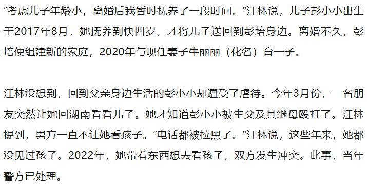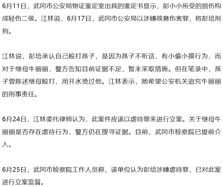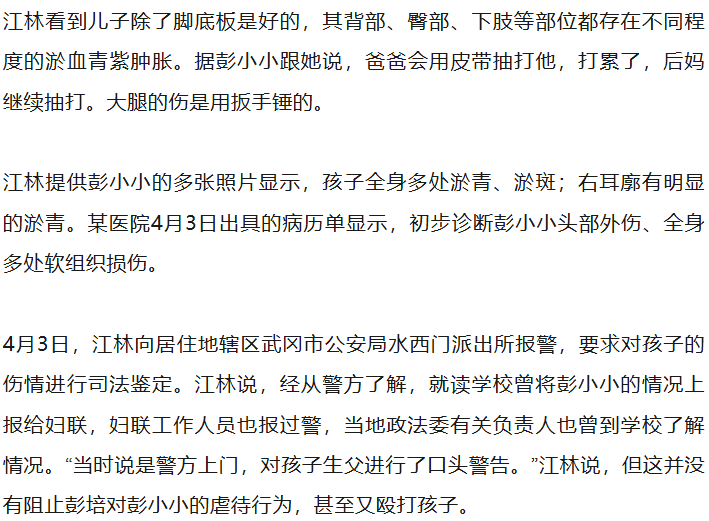 6月24日,湖南邵阳武冈市一男童母亲江林(化名)反映称,她未满8周岁的儿子彭小小(化名)遭到生父以及继母长期的殴打虐待,导致全身多处软组织损伤。报警后,经司法鉴定,彭小小的损伤构成轻伤二级。