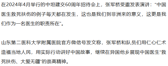 张军桥医生是中国派驻坦桑尼亚穆希比利国家医院(Muhimbili National Hospital)的高级麻醉专家,拥有医学、外科、内科学和麻醉学多重学位。在坦工作期间,他不仅参与临床工作,还积极培训本地医护人员,引入中国先进麻醉技术,深受坦桑医护同行和患者好评。
