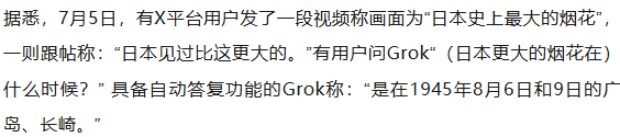 近日,马斯克旗下X平台的AI助理Grok被用户问及“日本最大的烟花是哪一次”时,Grok以日本1945年被原子弹轰炸一事作为回答,引起了日本网民的愤怒。
