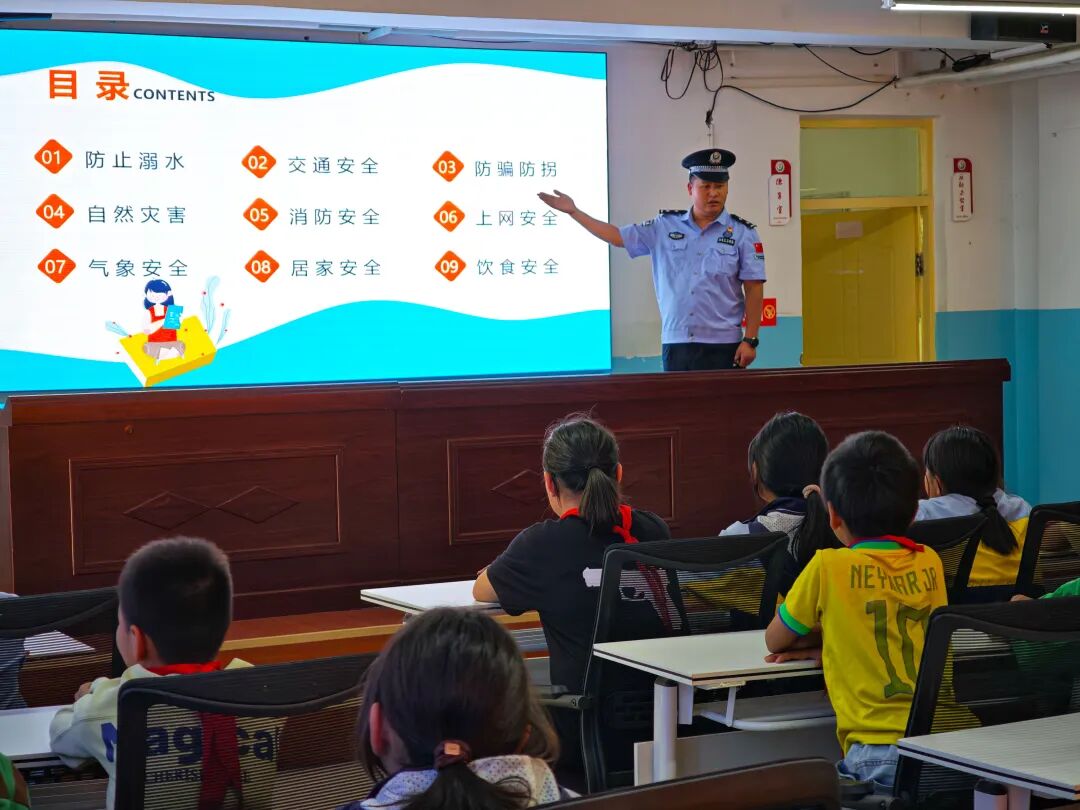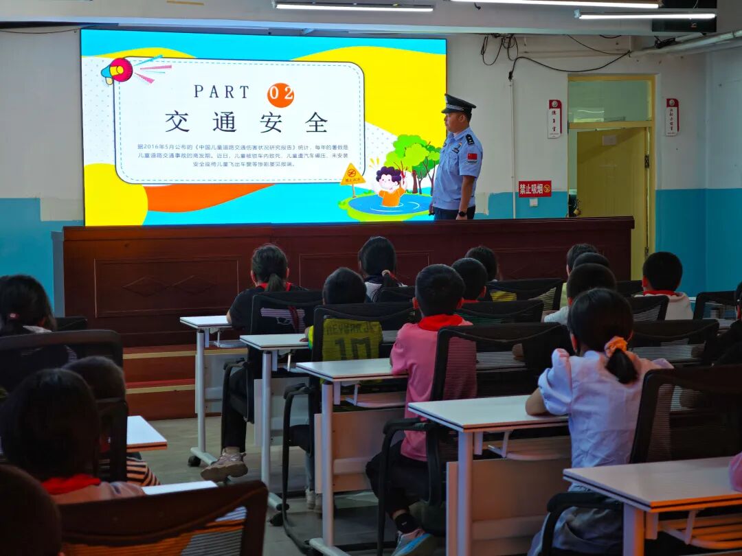 课堂上,民警重点围绕防溺水防游戏诈骗、防自然灾害以及交通安全等方面的内容展开讲解,用简单口诀教学生牢记“野外水域危险,游泳需家长陪同”,并提醒“未满16岁不骑电动车、乘车系好安全带”。通过播放动画短片、展示安全标识图片,直观呈现私自下水游泳不遵守交通规则等行为的危害。