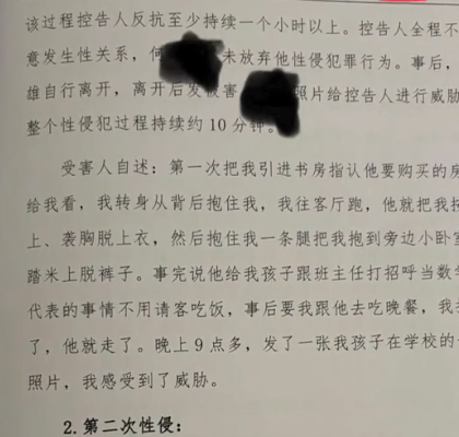 该家长刘女士介绍,何某是其女儿学校的招生老师,此前主动加自己微信,声称方便交流。在孩子入学后,何某又提出帮刘女士孩子在班内弄一个职务。2023年9月5日,何某声称家访,谁知当天强行和她发生性关系。此后又陆续强行发生了两次性关系。