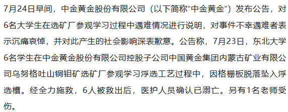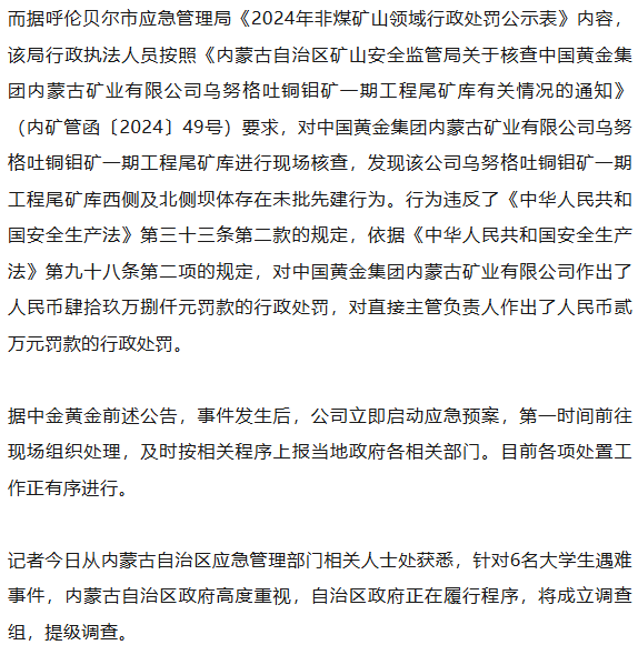 今日,“6名大学生在内蒙古企业参观学习中坠落溺亡”持续引发关注。记者梳理发现,涉事中国黄金集团内蒙古矿业有限公司(以下简称“中金内蒙古矿业”)在2021年被发现27条隐患。而在2024年,中金内蒙古矿业还因未批先建,企业和主管负责人共被罚款51.8万元。