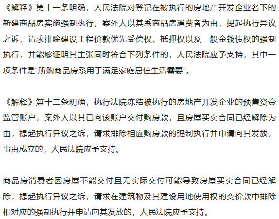 今起施行!最高法明确支持烂尾楼业主“拿回”购房款发表时间:2025-07-24 12:50来源:西部时报 ![]() ![]() 7月23日,最高人民法院对外发布《关于审理执行异议之诉案件适用法律问题的解释》(以下简称《解释》)。 执行异议之诉,是指当事人和案外人对执行标的实体权利存有争议,请求执行法院解决争议而引起的诉讼。 其中明确,商品房消费者因房屋不能交付且无实际交付可能,导致房屋买卖合同已经解除,请求在变价款中支持其价款返还的,人民法院应予支持。 《解释》自7月24日起施行。 更侧重保护买房人合法权益,对烂尾楼业主意义重大 近年来,执行异议之诉案件呈逐年上升态势,而且长期以来,执行异议之诉裁判规则相对匮乏,缺少专门规定,多参照执行程序中的相关规定进行审理,相当程度上存在救济制度界分不清、审执协调衔接不畅、关联纠纷合并处理困难、程序空转一案结多案生、法律适用尺度不一,以及滥用诉权诚信缺失、虚假诉讼时有发生等问题。 ![]() 值得注意的是,此次发布的《解释》共二十三条,对于商品房消费者权益保护,《解释》进行了细化、具体的规定,明确请求办理所有权转移登记手续、合同解除后已付购房款处理等的条件,使商品房消费者权益保护在实践中更具可操作性。 同时,明确了被征收人排除强制执行的具体条件。因家庭居住生活需要且遵循市场经营秩序而购房的商品房消费者,可以对抗房地产开发环节中商业利益的执行;财产因公共利益需要依照法律规定的权限和程序被征收的,被征收人的民事权益应予特别保护。 ![]() 来源:每日经济新闻 编辑:王宇豪 | 审核:嘻嘻 END ![]() 声明:部分文章来源于网络,转载发布,版权归原作者所有,仅作为参考,如果网站中图片和文字侵犯了您的版权,请联系我们处理!发布是出于传递更多信息之目的并不意味着赞同其观点或证实内容的真实性。http://www.westtimes.cn/h-nd-6527.html