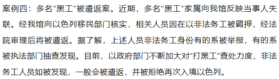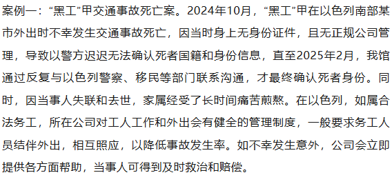 8月26日,中国驻以色列大使馆发布提醒:近期,中国驻以色列使馆接到多起领事求助案件。一些在以务工人员“打黑工”发生意外,给自己和家人带来难以挽回的损失和痛苦,教训深刻,令人惋惜。中国驻以色列使馆再次提醒中国公民,来以务工请务必通过正规渠道,严格遵守中以劳务合作政策要求和当地法律规定,签订正规劳务合同并投保相应保险,持有效签证合法务工。特别要提高警惕和鉴别能力,不要听信“黑中介”夸大宣传和高薪诱惑,切勿违法“跳槽”,以免沦为“黑工”后追悔莫及。现选登部分“黑工”权益受损典型案例,供大家了解并引以为戒(因涉及个人隐私,所有案例均隐去当事人姓名)。