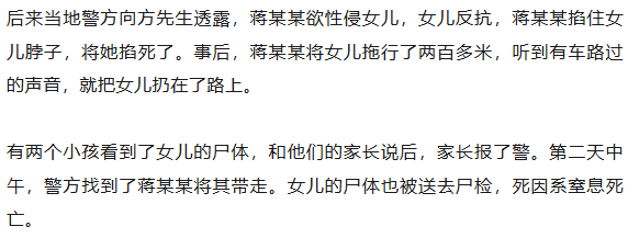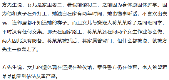 方先生介绍,自己和妻子一直在海南打工,平时留女儿一个人在家。7月6日晚上,女儿被一名女同学叫出去玩,去这名女同学的堂哥家,那晚有十几个人在她堂哥家,其中有几名女儿的同班同学,包括同学蒋某某。