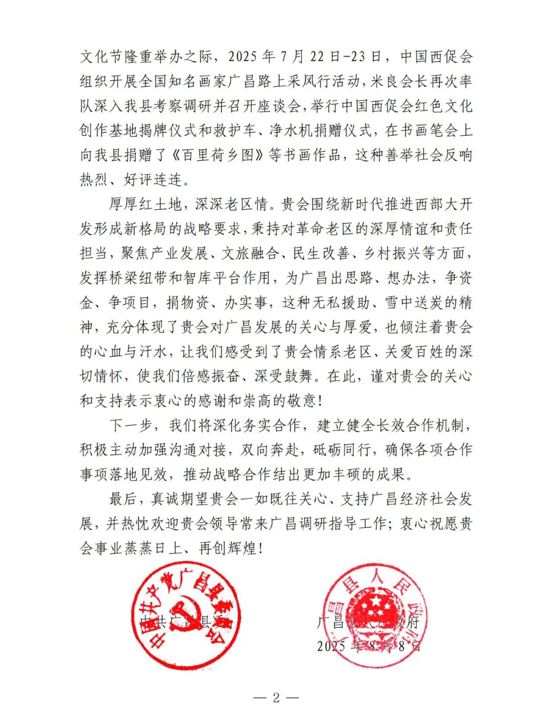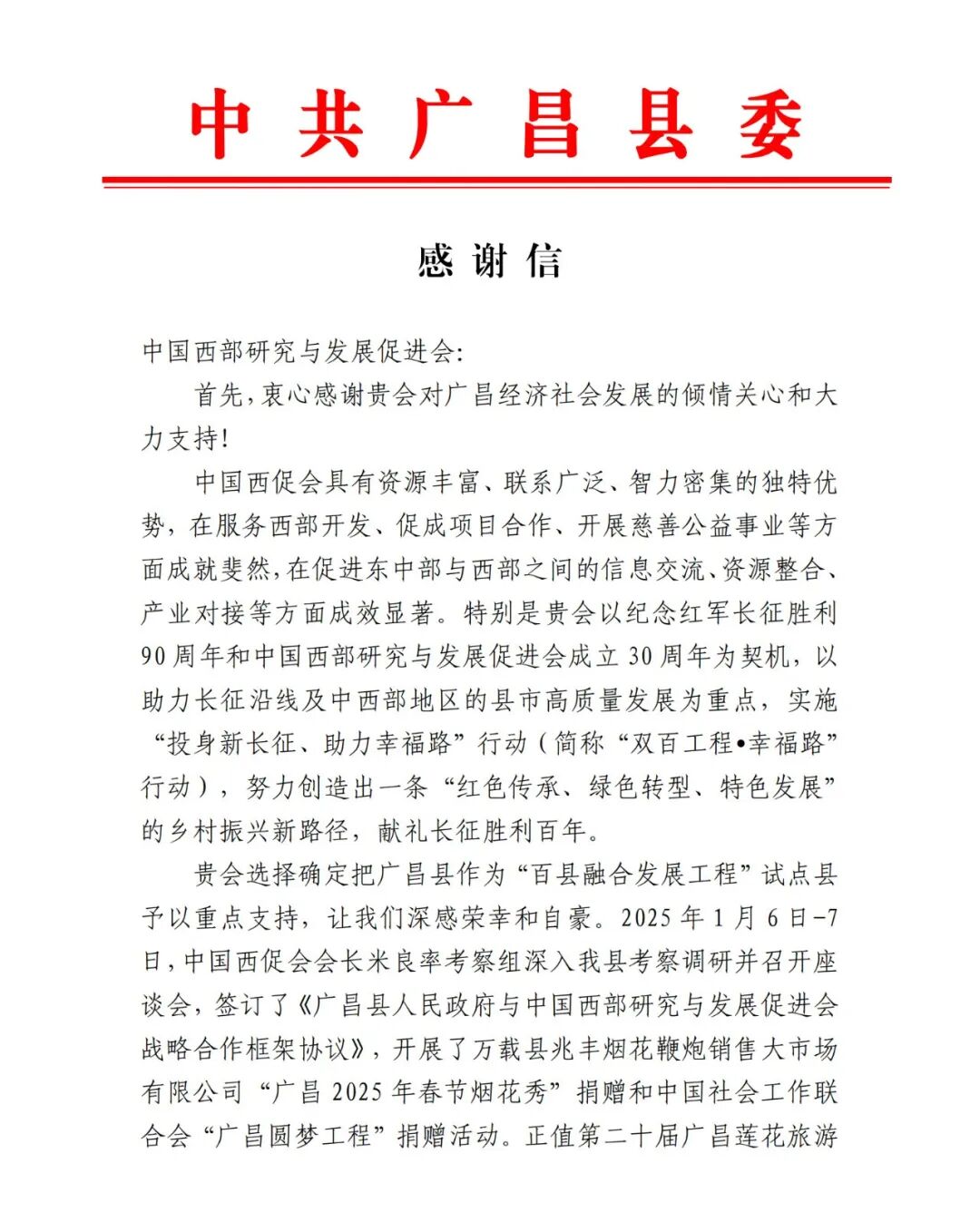 广昌县委致信感谢中国西部研究与发展促进会:情系老区办实事 深化合作启新程发表时间:2025-08-30 20:30 ![]() 近日,中共广昌县委向中国西部研究与发展促进会(以下简称“西促会”)发出感谢信,真挚感谢西促会长期以来对广昌革命老区经济社会发展的倾情关怀与鼎力支持,高度肯定双方合作取得的丰硕成果,为后续深化务实合作凝聚共识、奠定基础。 感谢信中指出,西促会作为服务西部开发、推动区域协同发展的重要平台,凭借资源丰富、联系广泛、智力密集的独特优势,在促成项目合作、开展慈善公益、推动东中西部信息交流与产业对接等方面成效卓著。特别是近年来,西促会以纪念红军长征胜利90周年、自身成立30周年为契机,启动“投身新长征、助力幸福路”行动(简称“双百工程•幸福路”行动),聚焦长征沿线及中西部县市高质量发展,探索“红色传承、绿色转型、特色发展”的乡村振兴新路径,为革命老区发展注入强劲动力。 值得一提的是,西促会将广昌县确定为“百县融合发展工程”试点县,给予重点支持,让广昌倍感荣幸与振奋。自2025年1月起,西促会会长米良便率队深入广昌考察调研,与县政府签订《战略合作框架协议》,同步推动“2025年春节烟花秀”“广昌圆梦工程”等捐赠活动落地;在第二十届广昌莲花旅游文化节举办期间,米良会长再次率队到访,不仅召开座谈会共商发展大计,更落地红色文化创作基地揭牌、捐赠救护车与净水机、赠送《百里荷乡图》等书画作品等一系列实事,善举引发热烈社会反响,赢得群众广泛好评。 感谢信中动情表示,西促会秉持对革命老区的深厚情谊与责任担当,围绕西部大开发新格局战略要求,聚焦广昌产业发展、文旅融合、民生改善、乡村振兴等关键领域,既当“智库”出思路、想办法,又做“桥梁”争资金、引项目,更以“实干”捐物资、办实事,无私援助、雪中送炭的精神,让广昌深切感受到贵会情系老区、关爱百姓的情怀,更激发了全县上下干事创业的信心与决心。 展望未来,广昌县委在信中明确,将以此次感谢为新起点,进一步深化与西促会的务实合作,建立健全长效合作机制,主动加强沟通对接,以“双向奔赴、砥砺同行”的姿态,推动各项合作事项落地见效、结出更丰硕果。同时,广昌也真诚期盼西促会能一如既往关心支持广昌发展,热忱欢迎贵会领导常来广昌调研指导,共绘革命老区高质量发展新蓝图。 ![]() ![]() END 声明:部分文章来源于网络,转载发布,版权归原作者所有,仅作为参考,如果网站中图片和文字侵犯了您的版权,请联系我们处理!发布是出于传递更多信息之目的并不意味着赞同其观点或证实内容的真实性。http://www.westtimes.cn/h-nd-7048.html