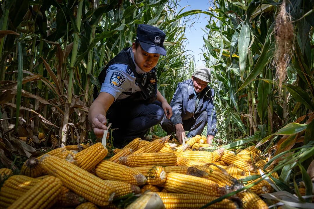 民警辅警与牧民一同掰棒子、剥玉米粒,并在劳动间隙与牧民边唠家常、听民意,边开展防范电信诈骗宣传,既减轻了农户的秋收负担,也在劳动中进一步密切了警民关系。