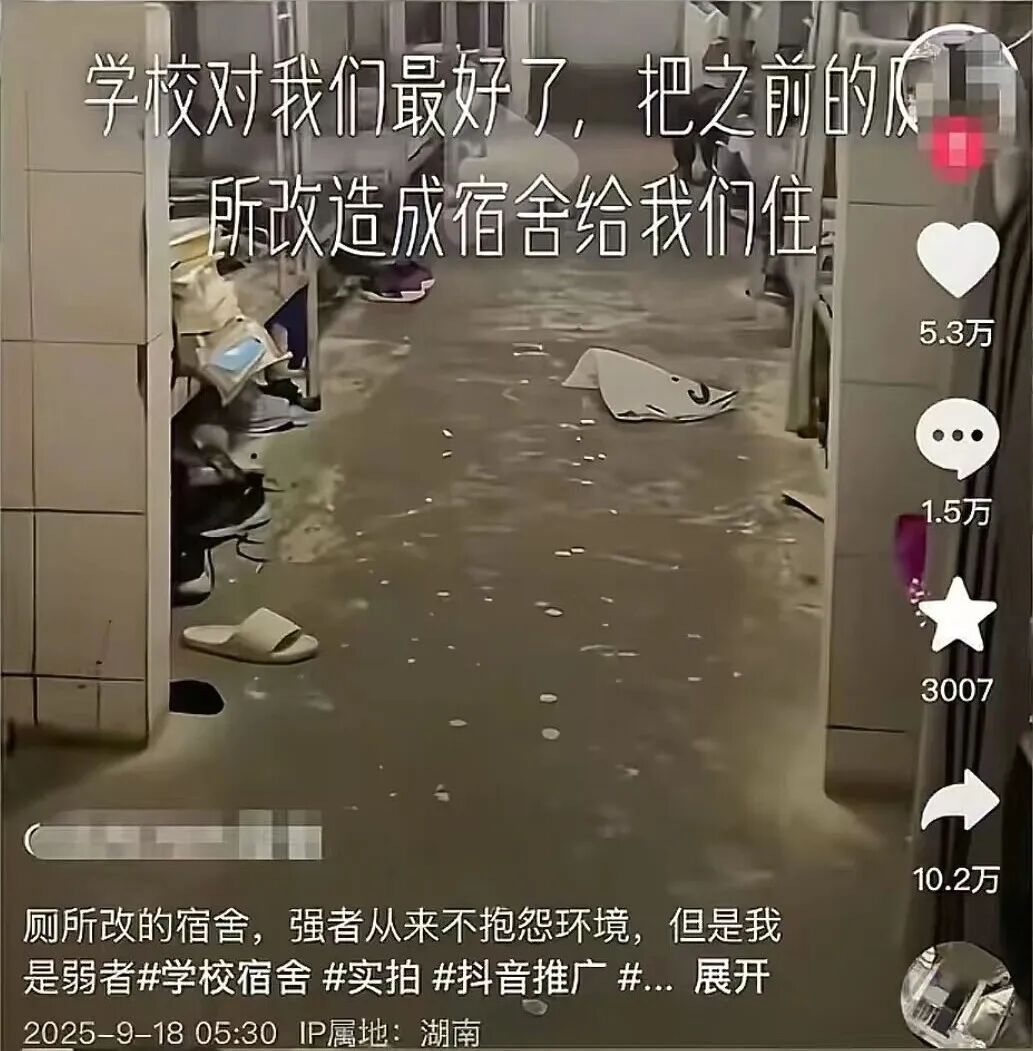 湖南一学校被曝将公共厕所改成宿舍让学生居住,多方回应发表时间:2025-09-18 16:05 ![]() 近日,有网友在社交平台发视频反映,湖南永州市工业贸易中等专业学校的学生居住环境极差,学校是将原来的公共厕所改造成了宿舍供学生住宿,引发广泛关注。 据该网友描述,自己居住的宿舍是学校食堂下面的地下室,还是一个公共厕所改造而成,天热的时候气味难闻。 网传视频画面显示,一扇绿色掉漆的木门被打开后,屋内有男生正在整理东西,两侧放置了多个上下铺,加起来有20多张床位。屋内光线昏暗,水泥地面又潮又脏。视频最后拍到了宿舍最里面是四个半开放的蹲便,每个蹲便肮脏不堪,隔断墙上的瓷砖也多处脱落。