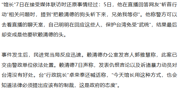台湾网红“馆长”陈之汉日前进行网络直播时,突然谈及“精准斩首”话题,甚至一度脱口“把赖清德狗头斩下来”。台湾“刑事局”迅速约谈“馆长”,此事也在岛内引发热议。