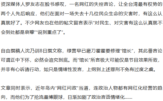 台湾《中国时报》称,台湾近年高度政治对立,不少偏激网络留言要伤害政治人物,有法官认为属言论自由不罚,但也有法官直言,纵使因政治立场不同有不满,也应循正常管道表达。