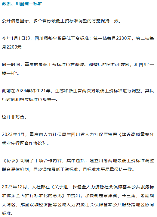 涨工资,落地!发表时间:2025-10-27 15:45 ![]() 近日,人力资源和社会保障部官网发布最新《全国各省、自治区、直辖市最低工资标准情况》。 数据显示,全国31个省(自治区、直辖市)最低工资标准第一档次均已迈入2000元。 ![]() 多地涨幅在10%以上 今年6月,中办、国办印发的《关于进一步保障和改善民生 着力解决群众急难愁盼的意见》提出,合理提高最低工资标准。 对比去年10月,至少已有18个省份调整了最低工资标准。 内蒙古在调整之后,最低工资标准第一档次为2270元,涨幅达14.65%。 除此之外,贵州、安徽、福建、重庆、四川、青海、广西等地该档次的涨幅也在10%以上。 调整之后,全国各省份最低工资标准第一档次均已达到2000元。 其中,上海以2740元名列前茅。北京、天津、广东、浙江、江苏和山东,达到2400元及以上。 值得一提的是,部分经济体量相对不大的省份,最低工资标准并不低。 比如,宁夏目前最低工资标准第一档次为2235元。 而根据2024年统计数据,宁夏全年全区实现生产总值5502.76亿元,人均地区生产总值为75484元。 这是因为,测算最低工资标准需要考虑多重因素。 今年9月,宁夏回族自治区人社厅官网对调整情况进行了说明: 此次最低工资标准调整综合考虑最低生活费用、职工个人缴纳的社会保险费、职工平均工资、经济发展水平、就业状况等因素,同时兼顾企业承受能力,将更好地保障低收入劳动者及其家庭成员的基本生活。 9月17日,西藏自治区人民政府办公厅转发《人力资源社会保障厅关于调整我区最低工资标准的意见》。 《意见》提出,将月最低工资标准由现行的2100元调整为2360元;将非全日制用工的小时最低工资标准由现行的20元调整为23元。调整后的标准从2025年11月1日起执行。 ![]() ![]() ![]() 来源:中国新闻网 编辑:王宇豪 | 审核:嘻嘻 END ![]() 声明:部分文章来源于网络,转载发布,版权归原作者所有,仅作为参考,如果网站中图片和文字侵犯了您的版权,请联系我们处理!发布是出于传递更多信息之目的并不意味着赞同其观点或证实内容的真实性。http://www.westtimes.cn/h-nd-7672.html