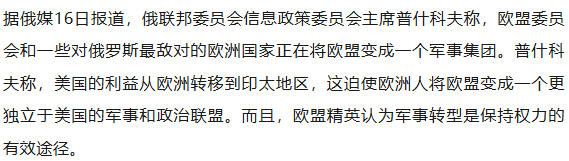 “欧盟将在2030年前做好与俄罗斯开战的准备。”美国“政治新闻网”欧洲版称,该军事计划草案于16日提交给欧盟委员会,计划显示5年内欧盟需要“拥有足够强大的防御态势,以有效威慑对手”。