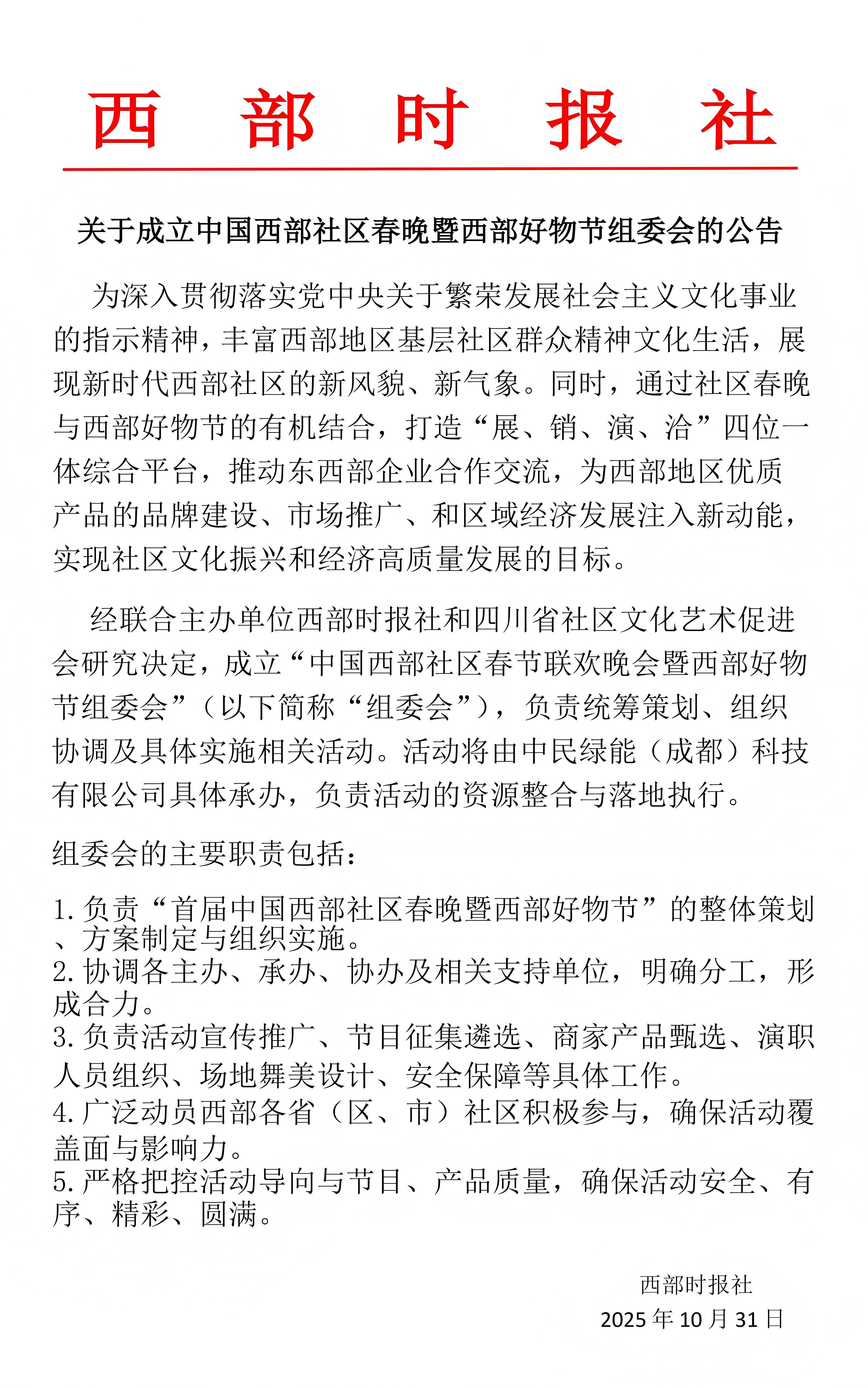 关于成立中国西部社区春晚暨西部好物节组委会的公告发表时间:2025-10-31 13:57来源:西部时报