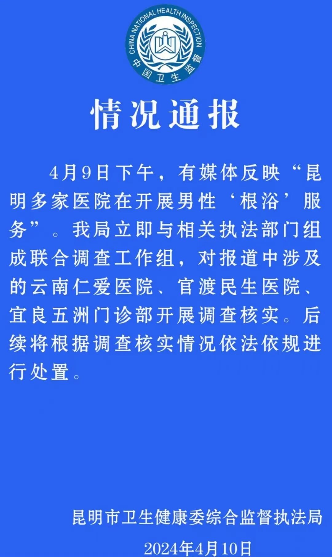 神秘的“根浴”,实为卖淫嫖娼?发表时间:2024-04-12 02:00 关注西部时报 近日,有媒体称反映云南省昆明市多家医院在开展男性“根浴”服务,引发广泛关注。 目前,当地卫健委目前已成立联合调查工作组,对报道中的相关涉事医院开展调查,并表示后续核实情况将会依法依规进行处置。 ![]() 昆明市卫健委通报 十多年前,就曾有部分会所推出的男性“根浴”新型服务,在备受争议后又消失沉寂于世。而这名为“根浴”的诊疗项目据说可以治疗男性疾病,但其效果目前并没有相应的科学根据,并且具有传染疾病的危险。 然而近期,昆明的几家民营医院内又重现这一项业务,纷纷开设名为“泌尿水疗手术室”的男性专属诊疗区域,明目张胆地的以“给男人更多的爱”为标语,宣称在此进行的全套“神秘水疗”将由美女护士亲手操作,并且“不分年纪都可以做”,患者们有病治病,没病保养,都被98元初体验的噱头吸引前往。 据一些男性患者反映,前述此项目的治疗流程完全违背正常医疗问诊程序:既不需要挂号,也不要登记患者的真实姓名,甚至没有要求患者前往医院的收费窗口进行行使正常的缴费流程,种种行为疑似这些医院打着医疗的幌子提供着色情服务。 早在1995年,国家就曾颁布相关法规,规定肩部以下,膝盖以上为非医疗机构异性按摩的禁地。 而体验价为98元的“根浴”,虽是使用名为“男性性功能康复治疗仪”的机器,进行“水疗”按摩,甚至升级为300元“手法”套餐后,可由男性患者点名女性护士单独进入房间内进行亲手服务,这样的无微不至的治疗,理应是色情服务,却在相关涉事医院的美化下,变成了“水疗”按摩,变成了没有任何副作用的中医穴位手法,和昂贵的西医诊疗相比,既便宜且见效快。 医院本应是神圣的救死扶伤的地方,可“根浴”这种带有不明确暧昧意味的业务词语,不该出现在这样庄重的场所却堂而皇之地在医院开展。 且通过其他媒体记者暗访镜头可以看到,对于“根浴”的效果如何、为何没有诊疗记录等问题,涉事的两家医院都是闪烁其词,这一所谓的“神秘水疗”究竟是不是有“水”而无“疗”也尚不得而知。 目前,相关部门已经介入,尚未确定“根浴”业务究竟是正规医疗还是色情擦边。 可以明确的是,在十多年前多家会所曾出现的根浴项目中,手法理疗被判定为卖淫嫖娼行为,和此次事件是否为同一性质尚待调查。 关于这次事件值得深思值得一提的是:“根浴”这一治疗项目已经设立有一段时间了,为何没有“患者”向当地部门举报? 另外;这些涉事医院的宣传又是如何做到遍布大街小巷,吸引大量“患者”挤得“泌尿水疗手术室”爆满,但都没被监管部门所发现。但肯定的是若这所谓的“根浴”只是噱头并无疗效,那必然也会被“患者”们所弃,被风清气正的社会所根治,这同样值得深思。 END 图文来源:昆明市卫健委 编辑:王宇豪 排版:王宇豪 审核:张芳烈 ![]() 关注西部聚焦 获取更多资讯 声明:部分文章来源于网络,转载发布,版权归原作者所有,仅作为参考,如果网站中图片和文字侵犯了您的版权,请联系我们处理!发布是出于传递更多信息之目的并不意味着赞同其观点或证实内容的真实性。http://www.westtimes.cn/h-nd-855.html