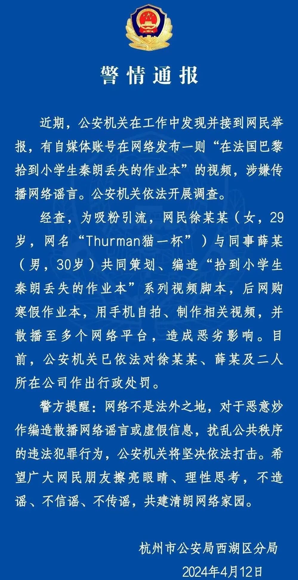 秦朗寒假作业事件果然是段子,千万粉丝网红造谣被禁言!发表时间:2024-04-13 19:13 “在法国巴黎捡获一年级学生秦朗的寒假作业”相关视频,曾经迅速引发全网关注热议,现在被查明是网红摆拍! 公安机关查明,发布视频的“网红”徐嘉艺(账号名“Thurman猫一杯”)与其公司编导薛某编造剧本,在网上购买寒假作业本,进行视频摆拍。 在B站,这条丢失寒假作业视频有1331.2万次观看,且“全站排行榜最高第2名”。 视频发酵期间,江苏南通的杨某为博取关注、吸粉引流,在该短视频下造谣某学校,并以“失主”舅舅身份摆拍、直播到书店购买新作业送给外甥,吸引大量网友观看。 这些网红均被处罚,分别被处以禁言和账号封停。 4月12日,浙江杭州市公安局西湖区分局就“秦朗丢作业”事件发布警情通报,并对徐某艺、薛某以及涉事公司处以行政处罚,并责令公开道歉,随后对其账号予以阶段性禁言。江苏南通公安机关已对杨某处以行政处罚,账号已关停。