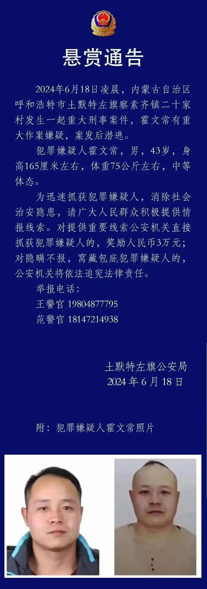 通告显示,犯罪嫌疑人霍文常,男,43岁,身高165厘米左右,体重75公斤左右,中等体态。通告还称,为迅速抓获犯罪嫌疑人,消除社会治安隐患,请广大人民群众积极提供情报线索。对提供重要线索公安机关直接抓获犯罪嫌疑人的,奖励人民币3万元;对隐瞒不报,窝藏包庇犯罪嫌疑人的,公安机关将依法追究法律责任。据了解,在该起事件中有5人遇害,截至目前,霍文常仍未被抓获。 察素齐,蒙古语,意为“造纸的房子”。据察素齐镇人民政府官方公众号,镇总人口11.65万人,其中农业人口3.54万人,流动人口约2.3万人。全镇总面积604平方公里,耕地面积18.3万亩,辖41个行政村。 网传图片显示,案发村庄多户人家大门紧闭,村内有一户人家的一侧大门与门前同侧外围的部分空地拉起了一条警戒线。 在村口,几名值班民警对试图进入村子的车辆进行检查,并告知村内有案发现场,正在勘查。同时有工作人员称,该地方目前是重点保护区,案件侦查期间外人不许入内。 有村民说,案件发生后,他们收到村里的提醒,要求他们关紧家门,尽量在家里呆着。“(案发后)头两天,连地里都不让去,今天才放松了一点”。 有知情人称,霍文常是家中独子,至今未婚。霍文常的母亲在他很小的时候便离世,平时他和70多岁的父亲生活在村里。“(霍文常)不喝酒,不打牌,也不打架。”村民说,如果不是看到悬赏的信息,根本想象不到霍文常会成为嫌犯。 另有知情人表示,被霍文常杀害的5口人是比霍文常年纪稍长的牛某某一家。在该起案件中,49岁左右的牛某某和他的父母双亲、叔叔、叔母均被杀害。 关于该起案件的起因,有村民称可能与十年前涉事两家人的土地纠纷有关,一个月前双方因架电线杆的事,也发生过矛盾,架设电线杆涉及占地,因此会有补偿,但霍文常和牛家各执一词,都说占的是自家地,最后谁也没拿到钱,电线杆绕出去了。 对此,十二家村胡姓村相关工作人员表示,目前案件正在由当地警方调查中,尚未有确切的定论,需等待调查结果。 6月24日,土左旗委宣传部一名工作人员透露,霍文常仍未被抓获。25日,内蒙古自治区公安厅表示,已经介入案件,但未进一步透露案件进展。 END 图片来源:土默特左旗公安局 编辑:王宇豪 排版:王宇豪 审核:溪溪 ![]() 关注西部聚焦 获取更多资讯 声明:部分文章来源于网络,转载发布,版权归原作者所有,仅作为参考,如果网站中图片和文字侵犯了您的版权,请联系我们处理!发布是出于传递更多信息之目的并不意味着赞同其观点或证实内容的真实性。https://www.westtimes.cn/h-nd-1614.html
