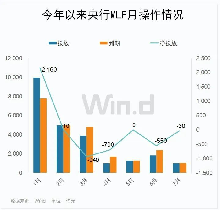 央行在7月15日进行的1年期MLF操作中,中标利率保持在2.50%,满足了金融机构的需求。Wind数据显示,7月共有1030亿元MLF到期,MLF操作微幅净回笼资金30亿元,这是央行今年3月、4月、6月和7月四个月缩量续作MLF了。