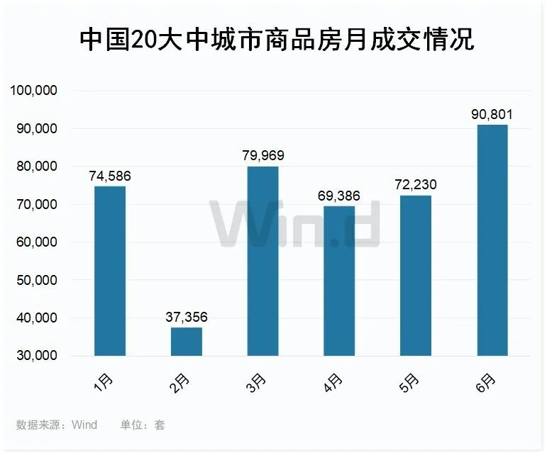 值得注意的是,随着房地产支持政策的快速落地和效应显现,楼市成交明显好转。Wind数据显示,中国20个大中城市6月份商品房成交超过9万套,环比大幅增长25.7%,创年内新高。价格方面,各线城市房价环比降幅总体收窄,房价下降城市数量有所减少。特别是上海和北京等一线城市的新房和二手房价格均出现企稳回暖的迹象。