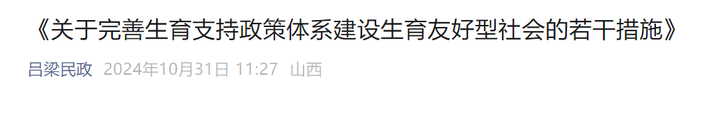 ![]() 一、做好青年婚恋服务。创建“青春吕梁”青年服务综合云平台,建立“未婚适龄、大龄青年数据库”,常态化组织相亲联谊活动,通过“线上”“线下”开展针对性、个性化婚恋服务。积极引导青年树立正确的婚恋观、生育观、家庭观。(牵头单位:团市委;配合单位:市总工会、市妇联) 二、鼓励适龄青年结婚。2025年1月1日起,在我市登记结婚(双方均为初次登记)且女方年龄在35周岁及以下的夫妇,给予1500元的奖励,由结婚双方在婚姻登记窗口领取。(牵头单位:市民政局;配合单位:市卫健委、市财政局) 三、加强妇幼健康服务。推进市县两级妇幼保健机构标准化建设和规范化管理,市级妇幼保健院达到三级标准,辖区人口30万以上的县级妇幼保健机构达到二级标准,辖区人口30万以下的县级妇幼保健机构应开设门诊。乡镇(街道)卫生院和社区卫生服务机构应配备妇幼保健专业技术人员。加强对村医的基本公共卫生服务能力培训,做好妇幼公共卫生服务工作。加强市、县级综合医院儿科建设,加强妇产科医生、儿科医生、助产士、妇幼保健人员等人才培养。做好出生缺陷防治工作,扩大产前筛查和诊断、新生儿疾病筛查的覆盖面,完善筛查、诊断、基本医疗和康复救助机制。(牵头单位:市卫健委;配合单位:市疾控中心) 四、推进“出生一件事”联办。实现出生医学证明、儿童预防接种、户口登记、医保参保、社保卡申领等“出生一件事”联办。(牵头单位:市行政审批局;配合单位:市卫健委、市公安局、市医保局、市疾控中心) 五、落实生育休假制度。严格落实婚假、产假、护理假、育儿假、哺乳假等制度。符合政策规定生育的,女方享受国家规定98日和省奖励延长60日产假,男方享受护理假15日。在婚假、产假、护理假、育儿假期间,享受与在岗人员同等待遇。对不落实相关规定的单位和企业,由县级以上人民政府人力资源社会保障行政部门责令整改。(牵头单位:市人社局;配合单位:市总工会、市妇联) 六、建立生育补贴制度。2025年1月1日起,对符合政策生育一、二、三孩且新生儿户籍登记在吕梁的家庭,分别补贴2000元、5000元、8000元,在户籍登记窗口领取;从生产后次年起,对符合政策生育二、三孩的家庭成员(包括夫妇双方及孩子)5年内参加城乡居民基本医疗保险个人缴费部分,分别给予30%、50%的补贴。(牵头单位:市卫健委;配合单位:市医保局、市财政局、市公安局) 七、发展普惠托育服务。办好公办托育服务机构,建成兼有指导功能和示范性质的市级托育综合服务中心,各县市区提高公办普惠托育质效。支持社区嵌入式托育、用人单位办托和家庭托育点发展。贯彻落实省卫健委、省发展改革委、省教育厅等11部门联合印发的《关于促进托育服务高质量发展的若干措施》(晋卫人口发〔2024〕3号),被评为市级示范托育机构的,市财政奖励5万元;被评为县级示范托育机构的,县级财政奖励3万元。开展婴幼儿照护服务职业技能培训,鼓励有条件的大中专院校开设婴幼儿照护服务相关专业或在学前教育中增加婴幼儿服务内容。对依法开办的托育机构,用电、用水、用气、用热等执行居民生活类价格政策。支持有条件的幼儿园利用现有资源开设托班,新建幼儿园按有关标准设置适当比例的幼儿托班。到2027年,各县市区开设托班的城区幼儿园占比不低于60%,新建幼儿园设置托班要占到80%。(牵头单位:市卫健委;配合单位:市教育局、市发展改革委) 八、强化教育支持保障。对2025年1月1日后符合政策出生的二、三孩,免除二孩上我市公办幼儿园和高中的学费,免除三孩上我市公办托育机构、幼儿园和高中的学费。对符合政策生育二、三孩家庭子女,根据家庭意愿,协调支持符合入学条件的同一家庭不同年龄段子女在同一学校入学。大力发展公办和普惠性幼儿园,推进城镇小区配套幼儿园建设,优先保障三孩入公办和普惠性幼儿园。(牵头单位:市教育局;配合单位:市住建局、市发展改革委、市财政局、市卫健委) 九、加强住房保障。有效扩大保障性住房供给,根据养育未成年子女负担情况实施差异化租赁和购买房屋的优惠政策,对符合住房保障条件的二、三孩家庭,优先配租,在户型选择等方面给予照顾。对符合政策生育二、三孩的家庭,公积金贷款额度提高到100万元。引导支持商业银行提供优惠购房商业贷款。(牵头单位:市住建局;配合单位:市住房公积金管理中心) 各牵头单位要会同有关部门认真研究,对相关举措制定具体操作办法,报市委办公室、市政府办公室、市委改革办备案。 END 来源:吕梁民政、吕梁日报 编辑:王宇豪 排版:王宇豪 审核:溪溪