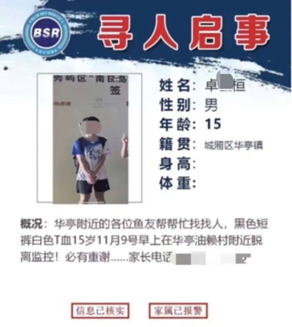 近日,福建莆田一家长发布寻人启事称,11月9日,15岁男孩卓某桓在莆田市城厢区华亭镇油濑附近走失,家人报警后仍寻找无果。 ![]() 据男孩家属介绍,孩子今年读初三,当天是在学校上课,班主任表示11月9日上午9点,卓某桓和另一名学生离校,当天穿着校服和短裤,是骑车离校的,随后母亲发现其中午未归家吃饭,觉得异常,随后联系校方,之后报警。 ![]() 男孩家属透露,孩子离校骑的自行车是在5公里外的河边被发现,都担心孩子因为心情原因出现意外。家属表示卓某桓因为和女友谈恋爱,一周前曾被女友家长在办公室扇过一巴掌,之后精神状态不佳,并且家人随后也没收了电子产品。“甩巴掌这件事班主任他没有和家长说,他本人也没说,这次才知道的。”